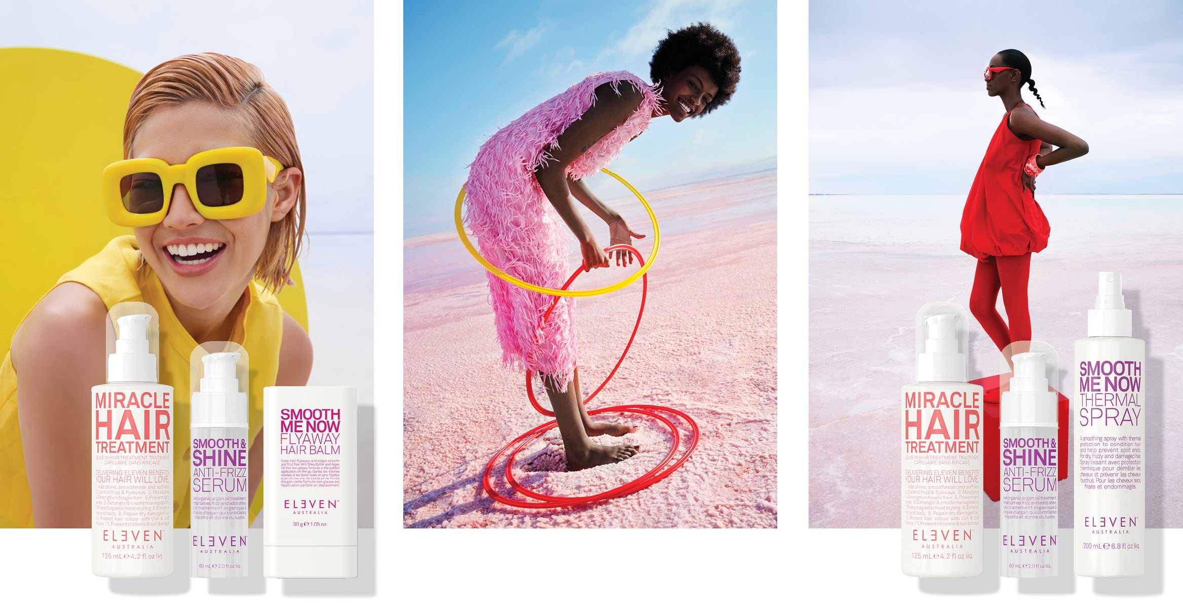 Ez a kampány bemutatja az ELEVEN Australia termékeinek sokoldalúságát és hatékonyságát, minden frizurát a márka ikonikus Miracle Hair Treatment termékével indítva. Ez a többfunkciós hajápoló hidratál, fényt ad, és UVA- és UVB-szűrőivel védi a hajat – akár egy naptej, csak éppen a hajnak. Tökéletes választás a kemény ausztrál napsütés elleni védelemhez a kültéri fotózások során.